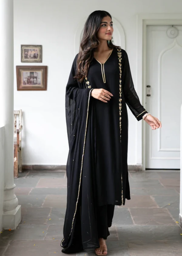 Exude timeless elegance with the Black Hand Embroidered Suit Set. Crafted from flowing black georgette, this straight-fit kurta features a graceful V-neck, three-quarter sleeves, and intricate gold embroidery on the neckline and kurta. Paired with matching pants and a dupatta, this set is perfect for celebrations where subtle luxury and traditional craftsmanship shine.