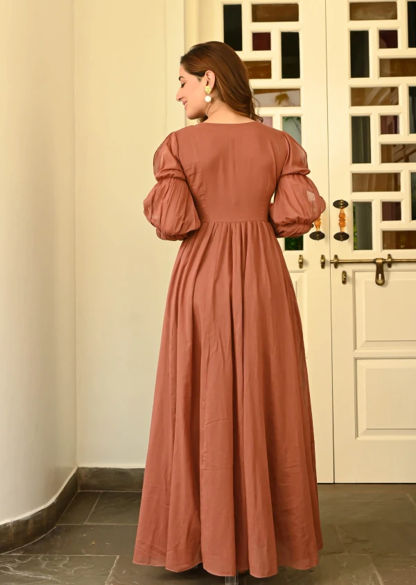 Prepare to make a striking entrance with the Brown Rust Cotton Dress, a true masterpiece that blends elegance and allure effortlessly. Its flowing and voluminous flare is a captivating sight that commands attention. The unique style of slit balloon sleeves adds a touch of whimsy and creates an enchanting silhouette. And let's not forget the cherry on top—the coin tassels delicately adorning the waist, adding a touch of charm and playfulness.