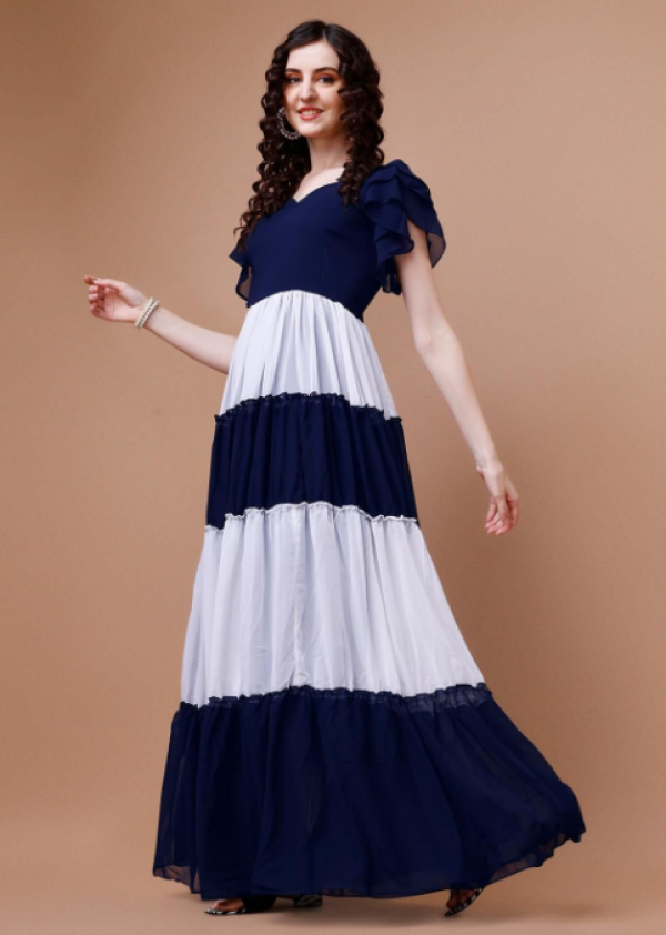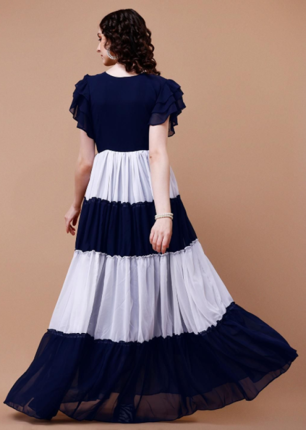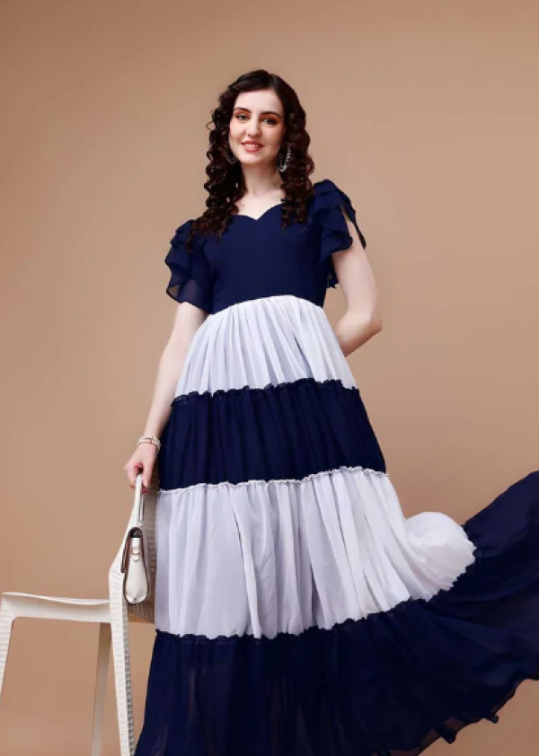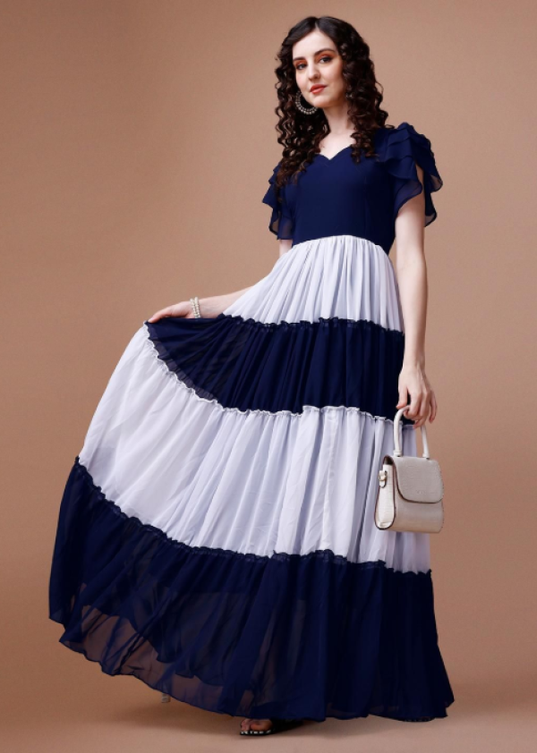 Lightweight and graceful, this blue and white georgette dress brings a fresh, flowing charm to your wardrobe—perfect for casual elegance and summer outings.