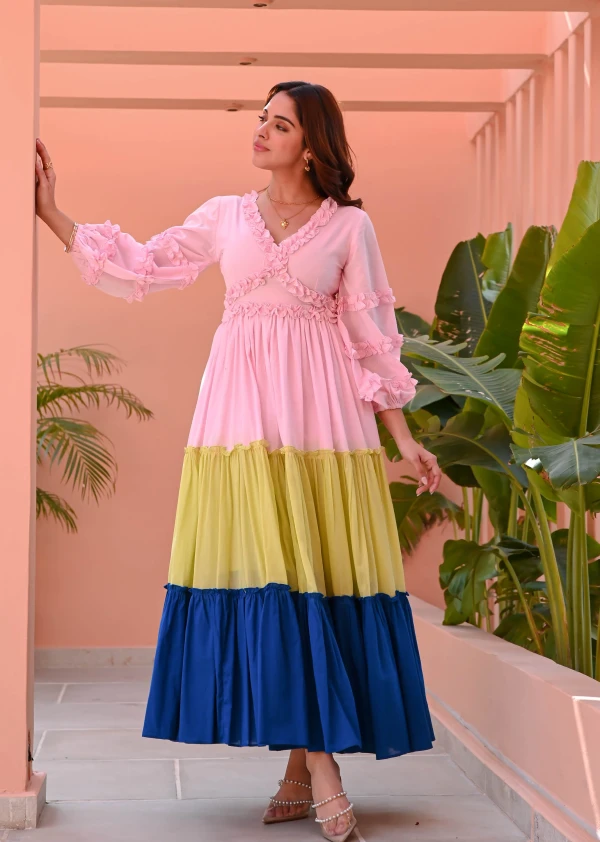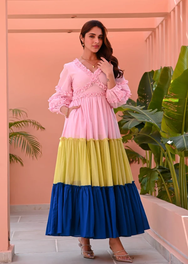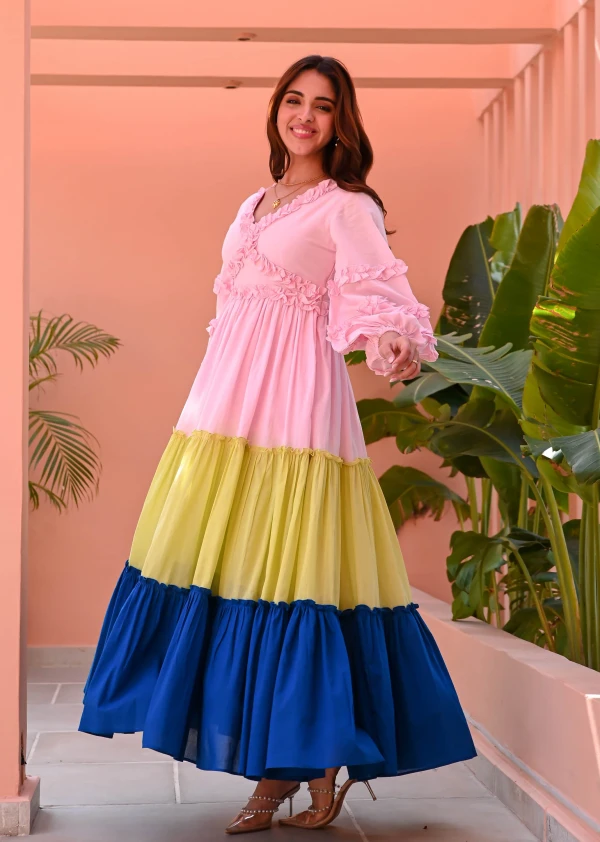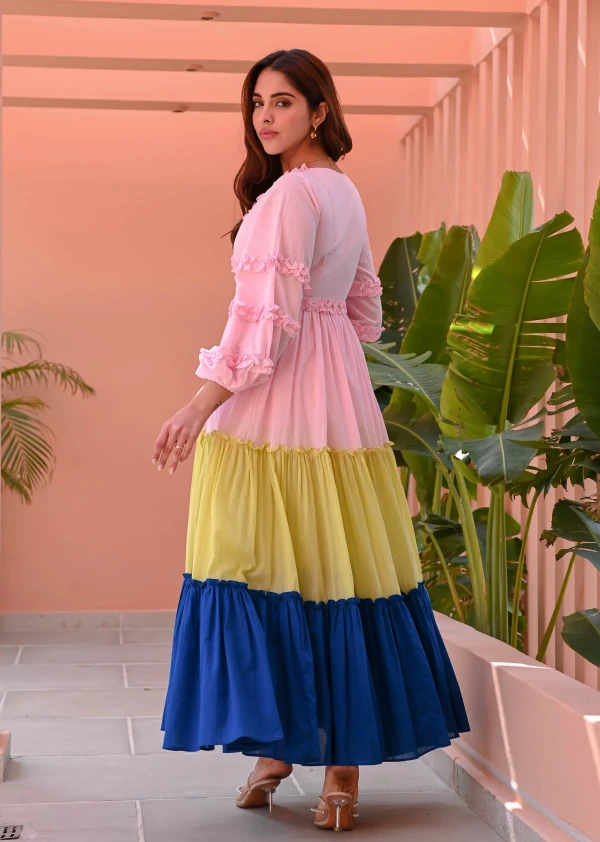 Playful hues and breezy elegance define the Multicolored Tiered Cotton Dress. Designed in a vibrant pink, yellow, and blue color-blocked cotton, it features a flattering V-neckline and voluminous puffed full sleeves. The tiered full skirt adds movement and charm, making it a perfect choice for effortlessly stylish days filled with color and grace.