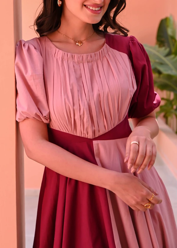 Vibrant hues and effortless style come together in the Boshon Peach Tango Cotton Dress. Crafted from breathable plum and peach cotton, this color-blocked beauty features a pleated bodice, short puffed sleeves, and a flowing two-tone full skirt. Perfect for twirling through sunny days, it’s a playful yet elegant addition to your wardrobe.