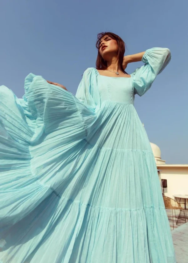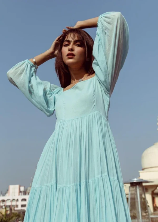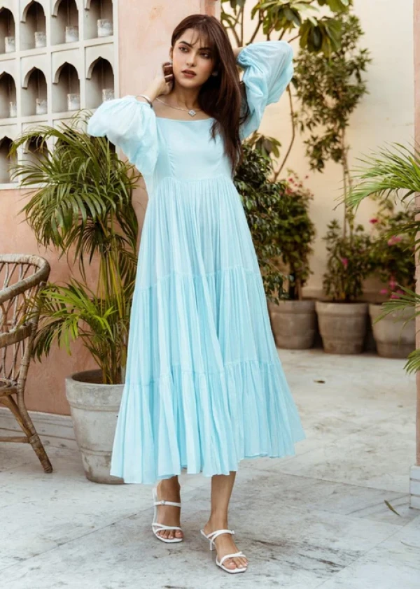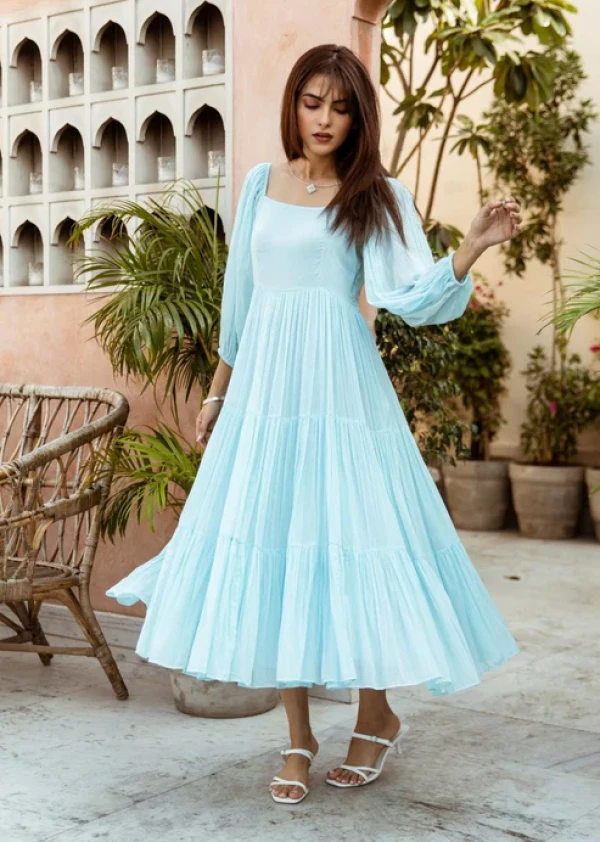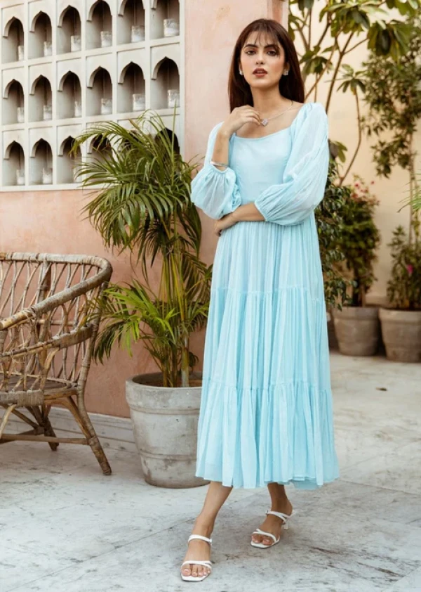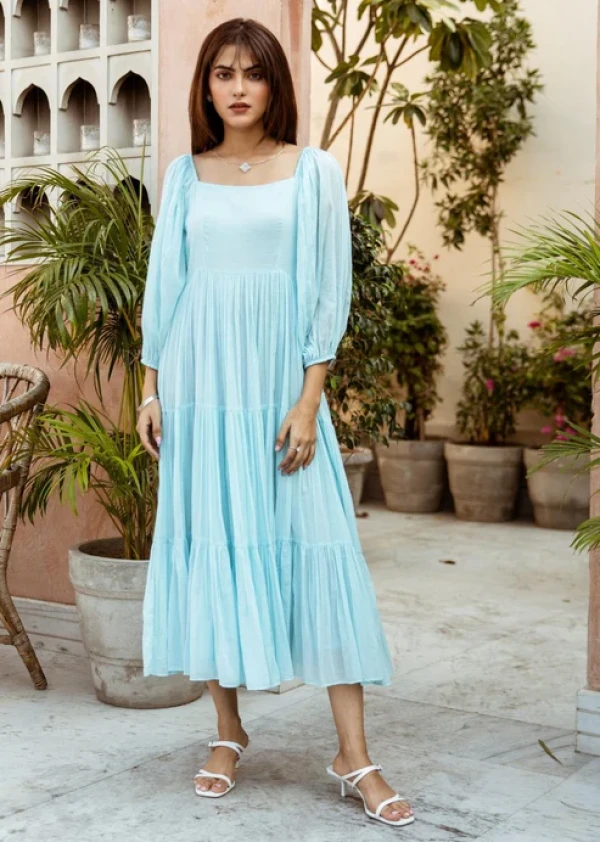 Boshon Powder Blue Square Neck Tiered Dress