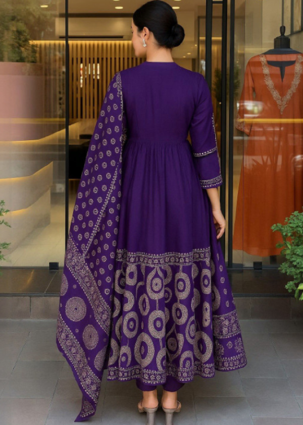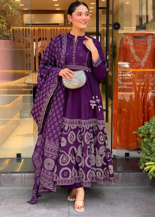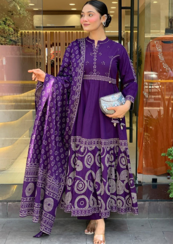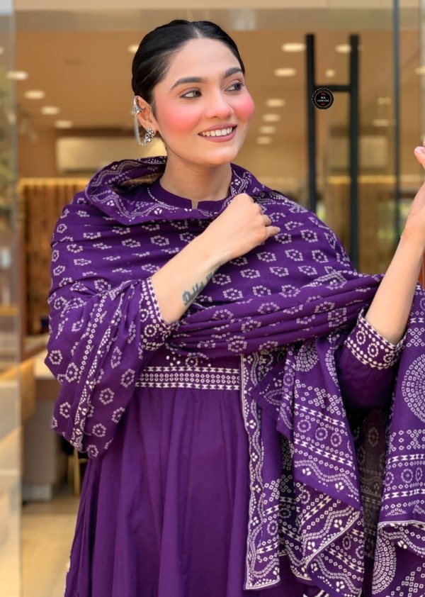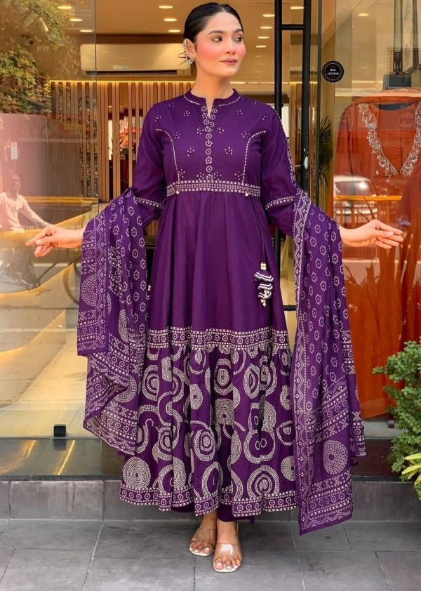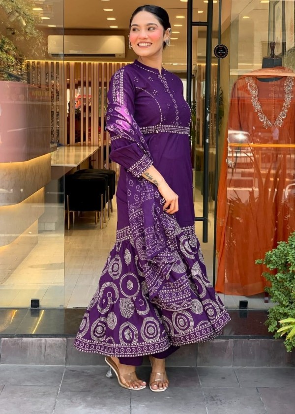 Crafted from premium cotton fabric with soft skin-printed Bandhej design, this elegant Anarkali set comes in a rich purple shade. Comfortable, breathable, and perfect for any festive or casual occasion.