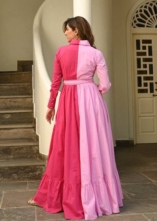 Soft yet vibrant, this two-tone pink cotton gown is perfect for brightening your day. With a flowing silhouette and breathable fabric, it's the ideal pick for both everyday charm and subtle occasions.