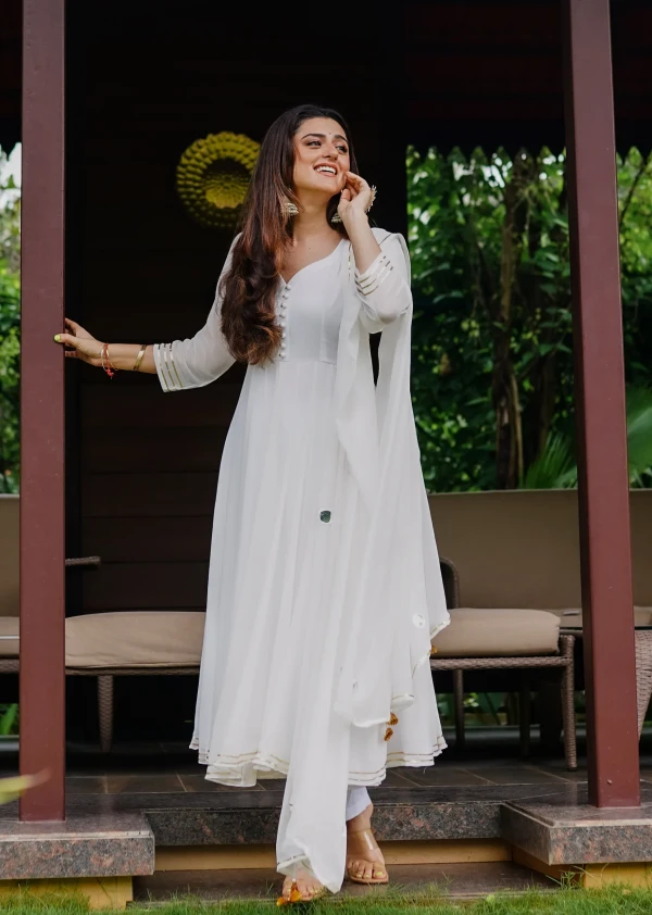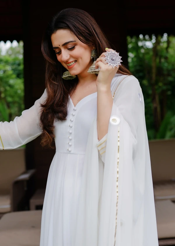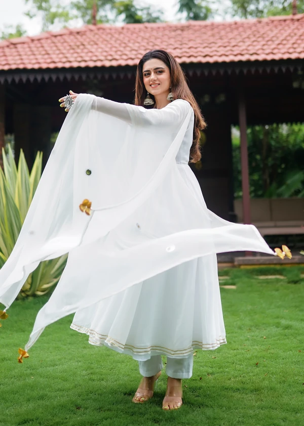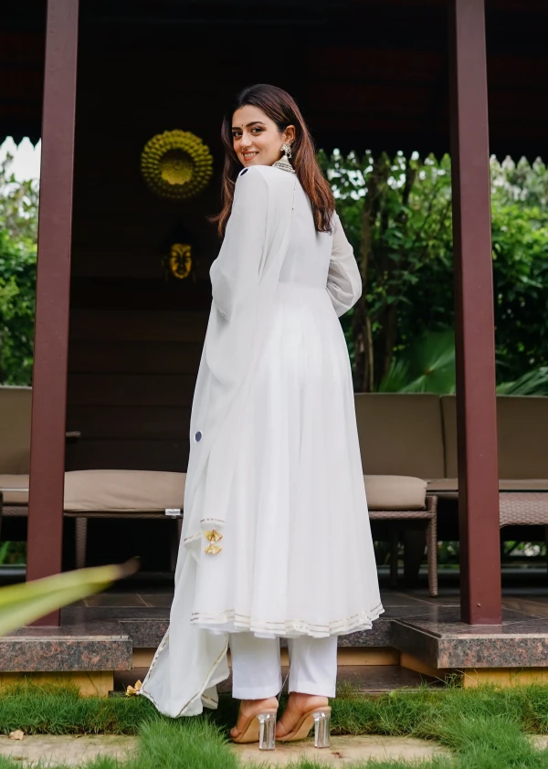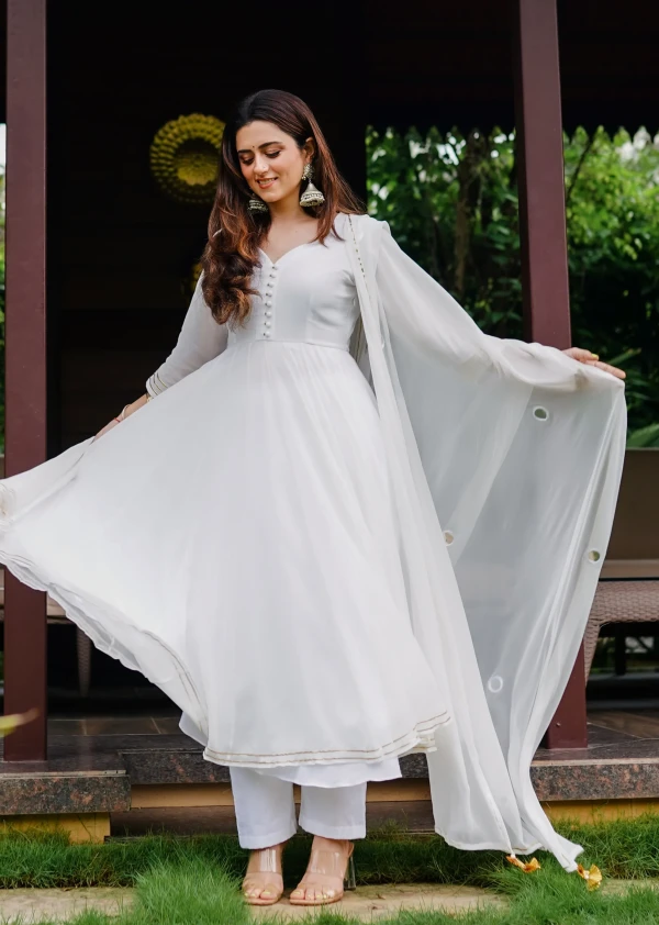 White Anarkali With Pant And Dupatta